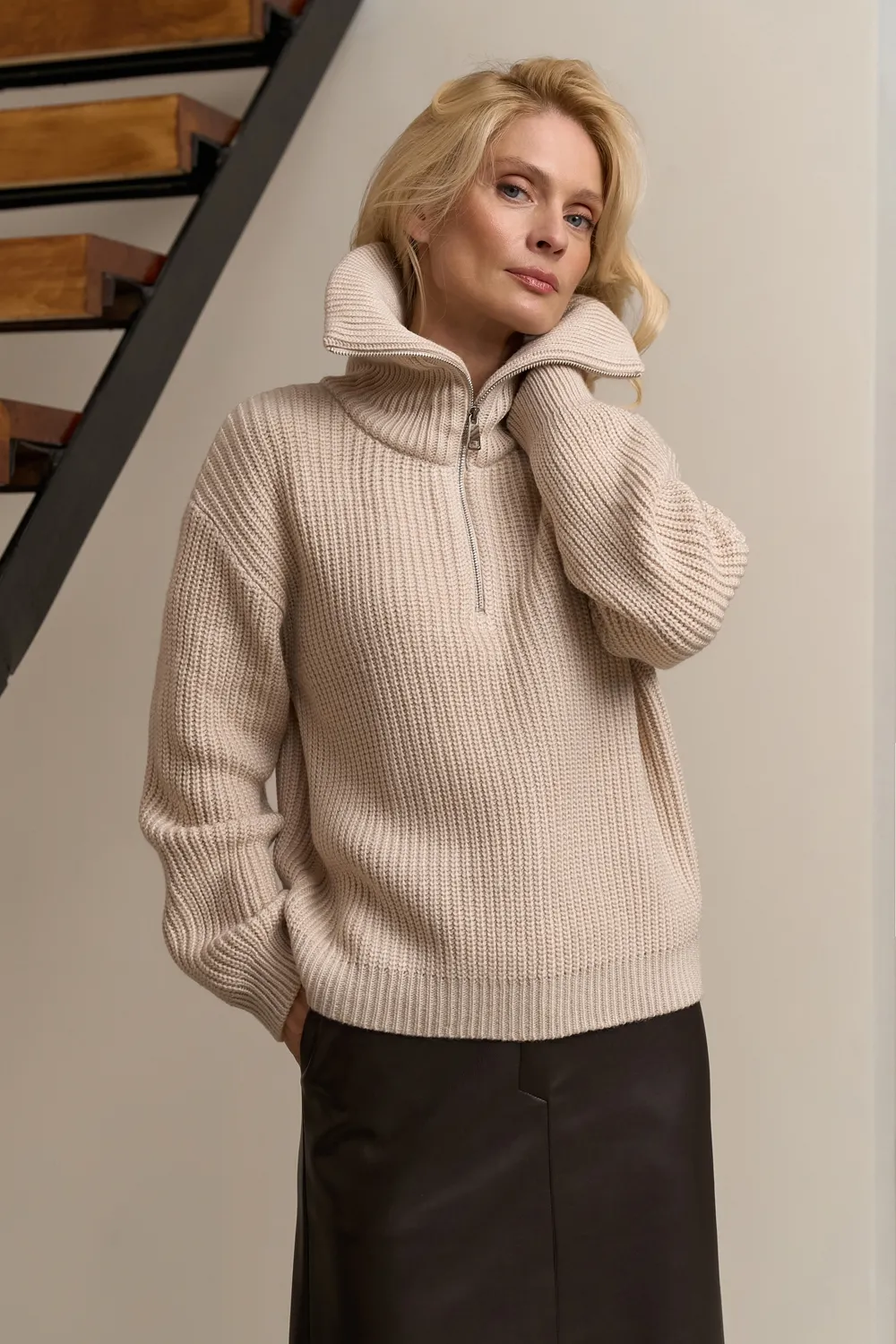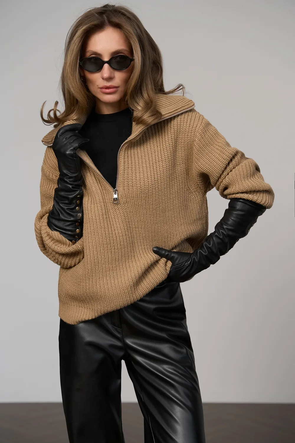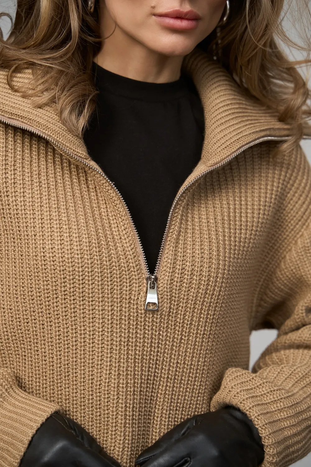 Актуальний светр прямого силуету з напіввовняної пряжі та з додаванням віскози. Виріб вільного крою. Має комір-поло, що добре тримає форму, і застібку-блискавку.
